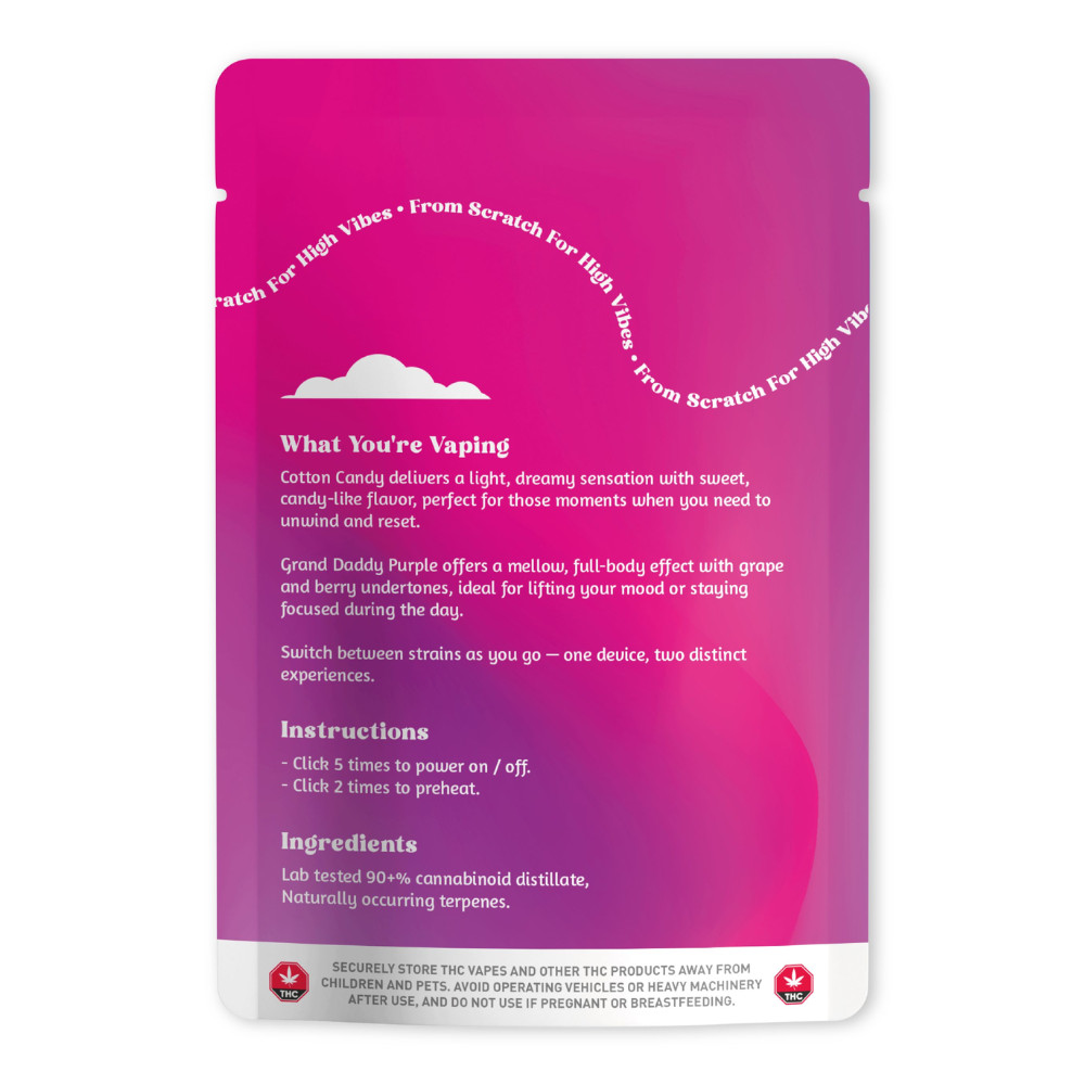 This 6-gram dual-chamber device combines two indulgent flavours designed for full-body calm and evening unwinding. Cotton Candy offers sweet, airy, sugar-spun notes with a gentle, uplifting body melt, while Grand Daddy Purple delivers classic grape richness and heavy indica relaxation. Users can switch between chambers or mix both strains using the three-mode selector for a fully personalized experience.