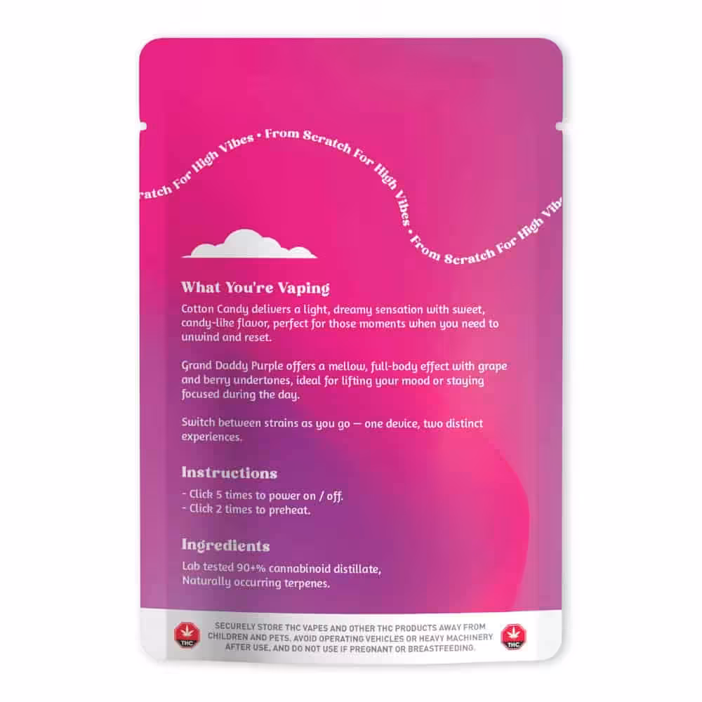 This 6-gram dual-chamber device combines two indulgent flavours designed for full-body calm and evening unwinding. Cotton Candy offers sweet, airy, sugar-spun notes with a gentle, uplifting body melt, while Grand Daddy Purple delivers classic grape richness and heavy indica relaxation. Users can switch between chambers or mix both strains using the three-mode selector for a fully personalized experience.