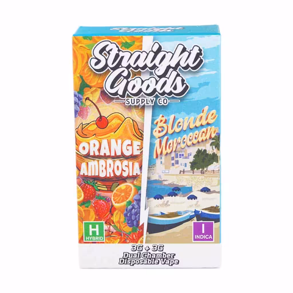 Straight Goods Dual Chamber Vape – Orange Ambrosia + Blonde Moroccan (6G) delivers a powerful dual-flavour experience using 95% solvent-less Delta-9 THC distillate and 5% organic terpenes. With two hybrid strain options in one device, it offers intense potency, smooth vapour, and versatile effects for any session.